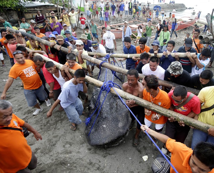 Moradores e voluntários removem um tubarão-baleia morto, encontrado na baía de Manila, nas Filipinas, onde ocorreu um vazamento de óleo no mês passado