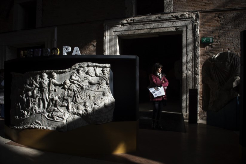 Trajano. Construir o império, criar a Europa tem centenas de peças que evocam o governante e o seu império e, mercê da localização, beneficia da proximidade de outros ícones arquitectónicos de Roma a ele ligados, como a célebre coluna de mármore com 38 metros de altura e coberta com 135 baixos-relevos (alguns dos quais reproduzidos na exposição) que figuram cenas da sua campanha vitoriosa contra os dácios (a Dácia corresponde, grosso modo, às actuais Roménia e Moldávia), entre os anos de 101 e 106. É na base deste monumento que estão as cinzas de Plotina e de Trajano, que morreu na Ásia Menor, quando regressava a casa depois de combater na Pártia (actual Irão).