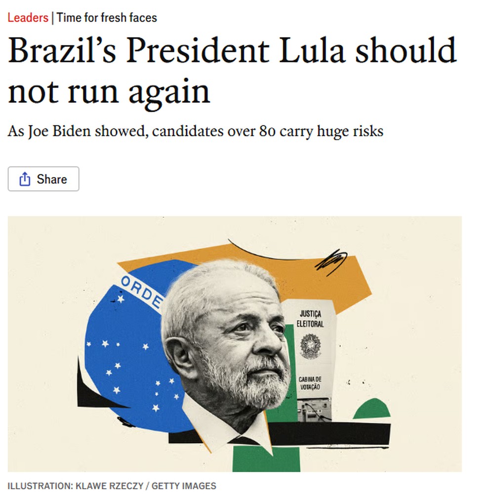 Editorial da revista britânica The Economist — Foto: ReproduçãoA revista compara o brasileiro ao ex-presidente americano Joe Biden, que desistiu da disputa pela Casa Branca meses antes da eleição.