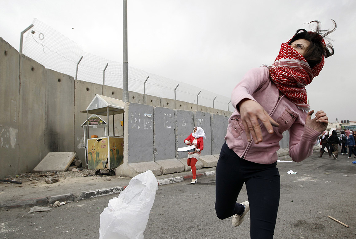Uma mulher palestiniana atira pedras contra militares israelitas durante confrontos que eclodiram após as comemorações do Dia Internacional da Mulher, Ramallah, Cisjordânia