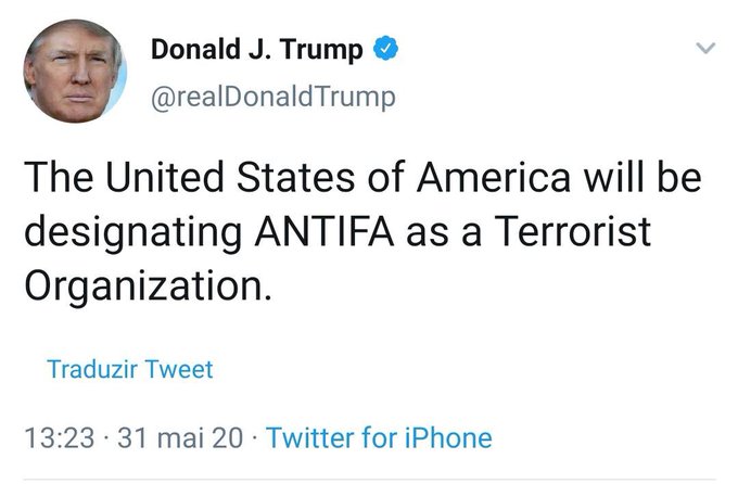 Os atos foram agravados na capital dos EUA após Trump dizer no Twitter que vai classificar o movimento antifascista como terrorista. A publicação foi compartilhada por Bolsonaro