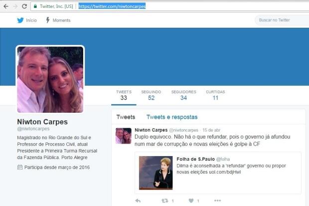 Em 27 de março, afirmou o seguinte: “Os petistas ainda continuam com a deslavada pachorra de falar em golpe… E as pedaladas, a corrupção e doações ilegais onde ficam???”.